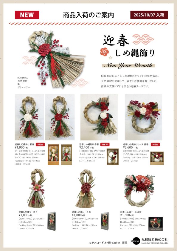 伝統的なお正月しめ縄飾りをモダンな雰囲気に!洋風のドアにも似合うテイストに仕上げた、迎春リースが新しく入荷しました。以下よりPDFをダウンロードいただけます。