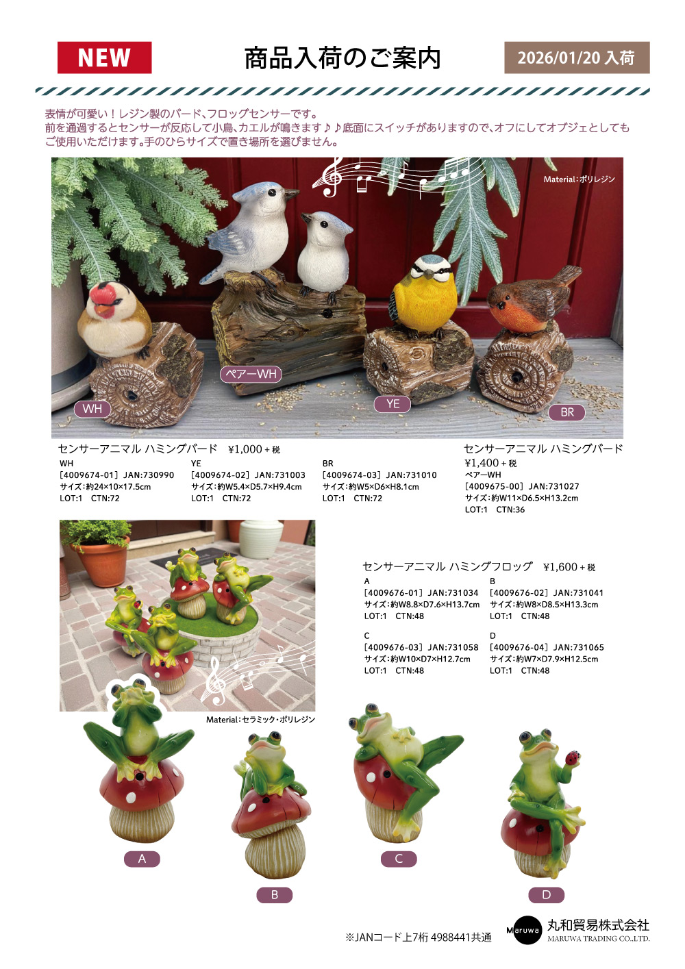 前を通過するとセンサーが反応して小鳥、カエルが賑やかに歌います♪レジン製のマスコット「センサーアニマル バード&フロッグ」が新しく入荷しました。以下よりPDFをダウンロードいただけます。