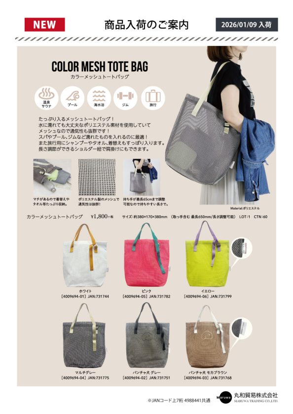たっぷり入る「カラーメッシュトートバッグ」が新しく入荷しました。スパやプール、ジムなど濡れたものを入れるのにも便利!持ち手の長さが調節できるので、手提げにも肩掛けもにも使えます。以下よりPDFをダウンロードいただけます。