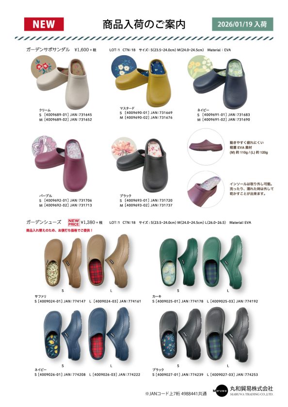 動きやすく疲れにくいEVA素材使用の「ガーデンサボサンダル」が新しく入荷しました。商品入れかえのため、旧商品はお値打ち価格でご提供。併せて是非ご覧ください。以下よりPDFをダウンロードいただけます。